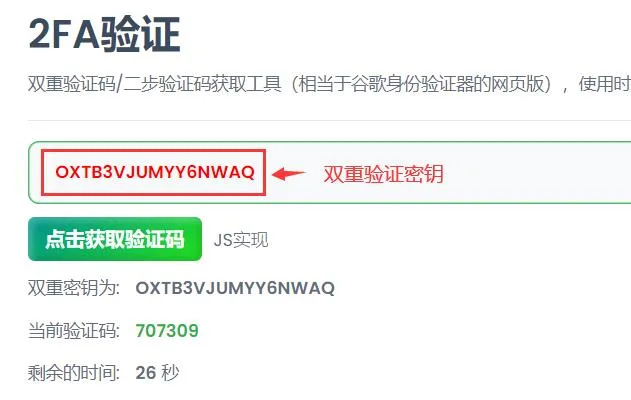 打开过后,复制双重验证密钥(下图仅为演示教程,你自己的双重验证密钥,在账号信息里面,格式说明看清楚了),到输入框,点击“获取验证码”,下面就会显示的当前验证码就是我们需要的验证码。